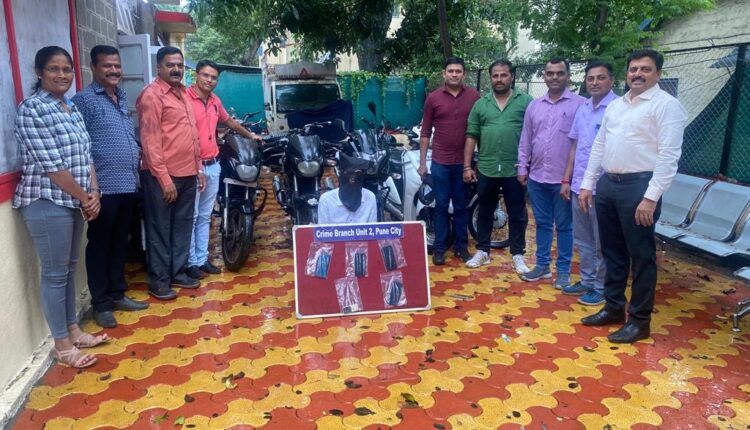 पुणे शहर प्रतिनिधी – पोलीस आयुक्त पुणे शहर यांनी दिलेल्या आदेशान्वये वाहन चोरीच्या अनुषंगाने युनिट 2 चे स्टाफ पेट्रोलींग करीत असताना युनिट २ कडील पोलीस अंमलदार समीर पटेल व कादीर शेख यांना त्यांचे बातमीदारामार्फत बातमी मिळाली की , पुण्यामध्ये येऊन वाहने चोरणारा शिक्रापुर येथील चव्हाण कॉम्पलेक्सचे बाजुला भुजबळ चाळ येथे भगवान मुंडे नावाचा एक इसम रहात असुन त्याचे जवळ वेगवेगळ्या कंपनीच्या दुचाकी गाड्या असुन सदर गाड्या संशयास्पद आहे अशी खात्रीशीर खबर मिळताच सदरची खबर युनिट -२ प्रभारी पोलीस निरीक्षक क्रांतीकुमार पाटील यांना कळविली असता त्यांनी सदर बाबत खात्री करुन कायदेशीर कारवाई करण्याचे आदेश दिले. त्यानंतर शिक्रापुर येथे तपासकामी बातमीचे ठिकाणी जावुन गुप्तपणे पाहणी केली असता बातमीप्रमाणे एक इसम संशयास्पद रित्या अॅक्टीव्हा गाडी क्रमांक एम एच १२ पी ई ६४९४ हिचेवर बसलेला दिसला. त्यानंतर बातमीप्रमाणे खात्री होताच आम्ही वरील स्टाफचे मदतीने सदर इसमास ताब्यात घेऊन त्यास त्याचे नाव पत्ता विचारता त्याने त्याचे नाव भगवान राजाराम मुंडे वय ३२ धंदा सिक्युरेटी व्यवसाय रापरभणी सध्या रा.भुजबळ चाळ चव्हाण, कॉम्पलेक्स शेजारी शिक्रापुर, असे सांगीतले . त्यास विश्वासात घेवून त्याचे ताब्यातील अॅक्टीव्हा गाडीबाबत विचारपुस केली असता त्याने अॅक्टीव्हा गाडी कमान हॉस्पीटल , वानवडी पुणे येथुन सुमारे १५/२० दिवसापुर्वी गाडी चोरी केल्याचे सांगितले .त्यानंतर सदर गाडीची डिक्की उडघुन पाहता त्याचे डिक्कीमध्ये वेगवेगळ्या कंपनीचे दोन मोबाईल फोन मिळुन आले सदर अॅक्टीव्हा तसेच मोबाईल फोन ताब्यातील इसमाने चोरी करुन आणले असल्याची दाट शक्यता वाटत असल्याने अधिक तपास केले असता आरोपीकडे 8 दुचाकी, 2 मोबाईल असा एकूण २,८२,००० / – रु मुद्देमाल जप्त करण्यात आलेला आहे. त्याबाबत खालील प्रमाणे गुन्हे दाखल आहेत.