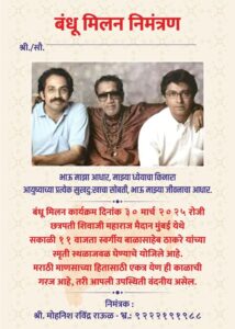 राज्यात लोकसभा आणि विधानसभा निवडणुका पार पडल्यानंतर सध्या सर्वच पक्षाकडून महापालिका निवडणुकांची तयारी केली जात आहे. मनसे अध्यक्ष राज ठाकरे आणि शिवसेना उद्धव ठाकरे पक्षाचे प्रमुख उद्धव ठाकरे हे एकत्र यावे यासाठी आता मुंबईतील मराठी सेना अॅक्शन मोडमध्ये आली आहे. येत्या गुढीपाडव्याच्या निमित्ताने ठाकरे बंधू मिलन कार्यक्रम आयोजित करण्यात आला आहे. मुंबईत हा कार्यक्रम पार पडणार आहे. यापूर्वी मराठी सेना पक्षाने दादर सेना भवन परिसरात राज ठाकरे आणि उद्धव ठाकरे यांनी एकत्र यावे अशा आशयाचे बॅनर लावले होते. त्यानिमित्ताने आज बाळासाहेब ठाकरे यांच्या स्मृतीस्थळावर निमंत्रण पत्रिका ठेवली आहे. ही निमंत्रण पत्रिका ठेवून बंधूत्वाचा संदेश देण्याचा प्रयत्न सुरु करण्यात आला आहे. येत्या गुढीपाडव्याला हा कार्यक्रम पार पडणार आहे. या कार्यक्रमासाठी राज ठाकरे आणि उद्धव ठाकरे यांना निमंत्रित केलं जाणार आहे. येत्या ३० तारखेला गुढीपाडव्याच्या निमित्ताने ठाकरे बंधू मिलन कार्यक्रम आयोजित करण्यात आला आहे. हा कार्यक्रम मुंबईत होणार आहे. या कार्यक्रमाची निमंत्रण पत्रिका देखील खूप व्हायरल होत आहे. बंधू मिलन निमंत्रण, भाऊ माझा आधार, माझ्या ध्येयाचा किनारा, आयुष्याच्या प्रत्येक सुख दुःखाचा सोबती, भाऊ माझ्या जीवनाचा आधार. बंधू मिलन कार्यक्रम दिनांक ३० मार्च २०२५ रोजी छत्रपती शिवाजी महाराज मैदान मुंबई येथे सकाळी ११ वाजता स्वर्गीय बाळासाहेब ठाकरे यांच्या स्मृती स्थळाजवळ घेण्याचे योजिले आहे. मराठी माणसाच्या हितासाठी एकत्र येण ही काळाची गरज आहे, तरी आपली उपस्थिती वंदनीय असेल, असे या निमंत्रण पत्रिकेत नमूद करण्यात आले आहे. मोहनिश रविंद्र राऊळ यांनी ही पत्रिका छापली आहे.