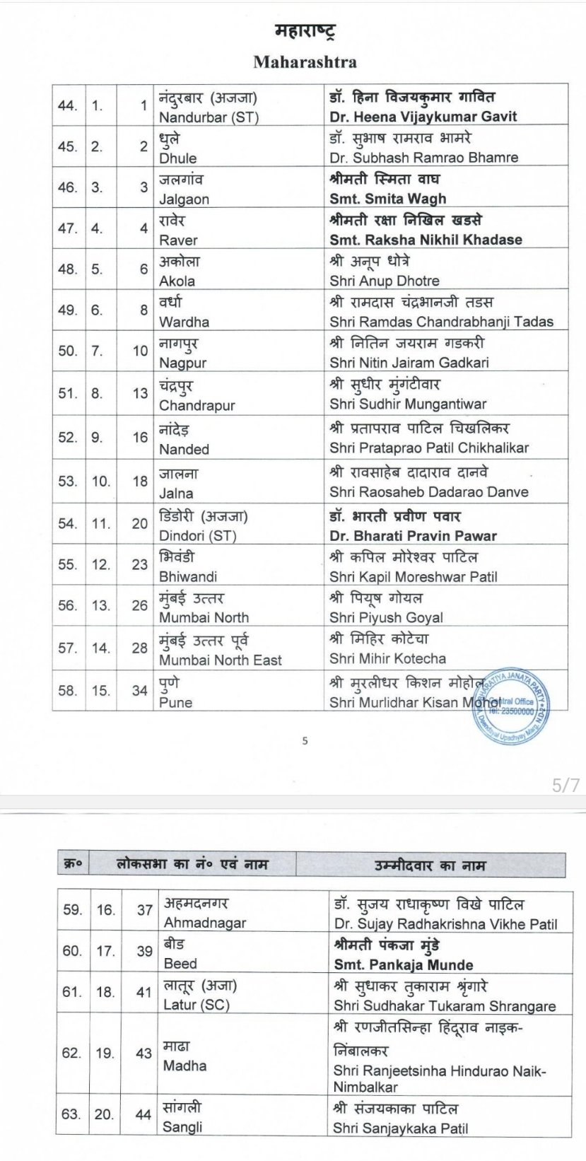 लोकसभा निवडणुकीसाठी भाजपने दुसरी यादी जारी केली आहे. दुसऱ्या यादीत महाराष्ट्रातील मोठ्या नावांचा समावेश आहे. यामध्ये केंद्रीय मंत्री नितीन गडकरी, बीडमधून पंकजा मुंडे, रावेरमधून रक्षा खडसे, नंदुरबारमधून हिना गावित, धुळे सुभाष भामरे, चंद्रपूरमधून सुधीर मुनगंटीवार यांची नावं आहेत. आगामी लोकसभा निवडणुकीच्या पार्श्वभूमीवर भाजपच्या यादीकडे सर्वांचं लक्ष लागलं होतं. आजच्या यादीमध्ये महाराष्ट्रातील एकूण 20 उमेदवारांचा समावेश आहे. नितीन गडकरी यांना नागपूर, नगरमधून सुजय-विखे पाटील, माढामधून रणजीत निंबाळकर, बीडमधून पंकजा मुंडे, रावेरमधून रक्षा खडसे यांना उमेदवारी जाहीर करण्यात आली आहे.