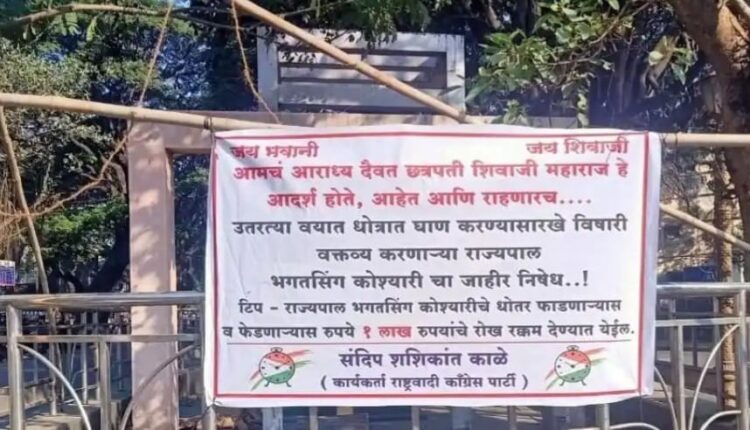 राष्ट्रवादी काँग्रेसचे कार्यकर्ते संदीप शशिकांत काळे यांनी शहरात फ्लेक्स लावून राज्यपाल कोश्यारी यांचा निषेध नोंदविला आहे. काळे यांनी लावलेल्या फ्लेक्सवर म्हटले आहे की,”आमचं आराध्य दैवत छत्रपती शिवाजी महाराज हे आदर्श होते, आहेत आणि राहणारच, उतरत्या वयात धोत्रात घाण करण्यासारखे विषारी वक्तव्य करणारे राज्यपाल भगतसिंह कोश्यारी यांचा जाहीर निषेध, पण त्याच वेळी बॅनरच्या खाली एक टीप लिहिली आहे यात राज्यपाल भगतसिंह कोश्यारी यांचे धोतर फाडणाऱ्यास आणि फेडणाऱ्यास रोख एक लाख रुपयांची रक्कम देण्यात येईल, असेही काळे यांनी म्हटले आहे. त्यामुळे हा वाद आणखी वाढण्याची चिन्हे आहेत. राज्यपालांच्या या विधानाचा राष्ट्रवादी, शिवसेना मनसे आणि काँग्रेस पक्षाकडून समाचार घेण्यात येत आहे. दुसरीकडे, भाजप आणि शिंदे गट यांनी मात्र यावर माैन बाळगले आहे.