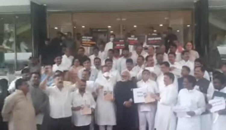 आज महाविकास आघाडीच्या आमदारांनी विधानभवनाच्या पायर्यांवर सरकारविरोधात जोरदार घोषणाबाजी केली. “खाऊन खाऊन पन्नास खोके, माजलेत बोके माजलेत बोके…”, अशी घोषणाबाजी करत विरोधकांनी शिंदे गटाची खिल्ली उडवली त्याचबरोबर “ईडी ज्याच्या घरी तो भाजपच्या दारी… स्थगिती सरकार हाय हाय…”, अशा घोषणा देत भाजपा सरकारी यंत्रणाद्वारे करत असलेल्या दबावाच्या राजकारणाचा निषेध केला. या घोषणाबाजीच्या वेळी विरोधी पक्षनेते अजित पवार आणि अंबादास दानवे यांच्या नेतृत्वाखाली महाविकास आघाडीच्या आमदारांनी सरकारला धारेवर धरलं. विधानभवनाच्या पायर्यांवर शिंदे फडणवीस सरकारच्या विरोधात साऱ्यांनी जोरदार घोषणाबाजी केली. त्यामुळे शिंदे सरकारच्या अडचणी वाढल्या आहेत.