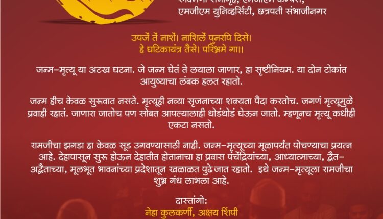 उपजें तें नाशें। नाशिलें पुनरपि दिसे। हे घटिकायंत्र तैसे। परिभ्रमे गा अर्थात जन्म-मृत्यू या अटळ घटना. जे जन्म घेतं ते लयाला जाणार, हा सृष्टीनियम. या दोन टोकांत आयुष्याचा लंबक हलत रहातो. जन्म हीच केवळ सुरूवात नसते. मृत्यूही नव्या सृजनाच्या शक्यतेला जन्म देतोच. एक जीव जातो आणि एक जीव जन्माला येतो हे अविरत रहाटगाडगे चालूच राहते. मृत्यूमुळेच जगणं प्रवाही रहातं. हे अधोरेखित करणारी दि. बा. मोकाशी यांची कथा दास्तांगो अक्षय शिंपी आणि नेहा कुलकर्णी ही दास्तानगोई आपल्या अभिनयाने विविध व्यक्तिरेखा, विविध भावभावना आपल्या समोर जिवंत करून आपल्या समोर सादर करणार आहेत. कार्यक्रमात निशुल्क प्रवेश असून रसिकांनी जास्तीत जास्त संख्येने उपस्थित रहावे असे आवाहन यशवंतराव चव्हाण सेंटर जिल्हा केंद्र छत्रपती संभाजीनगरचे अध्यक्ष अंकुशराव कदम यांनी केले आहे.