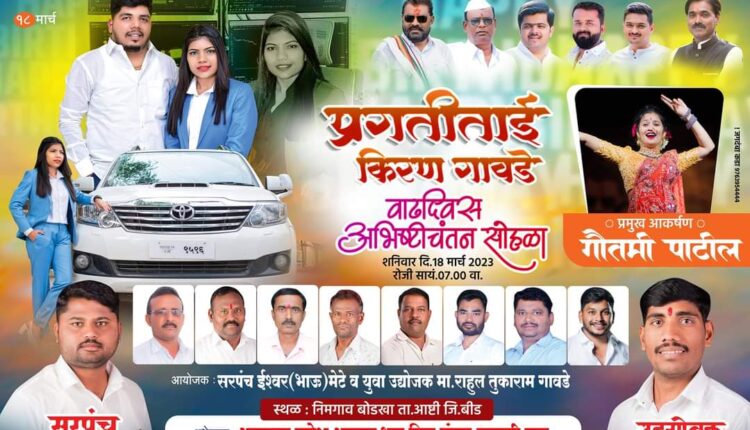 आष्टी तालुक्यातील निमगाव बोडखा येथील किरण गावडे यांची पत्नी प्रगती गावडे यांचा वाढदिवस होता. पत्नीच्या वाढदिवसानिमित्त चक्क नृत्यांगना गौतमी पाटील हिचा कार्यक्रम घेण्यात आला. यामुळे याची बरीच चर्चा झाली आहे. एखाद्या महिलेच्या वाढदिवसानिमित्त गौतमी पाटीलचा शो हा राज्यातला पहिलाच प्रयोग ठरला आहे. गौतमी पाटील हिच्या हस्ते केक कापून हा वाढदिवस साजरा करण्यात आला.या अनोख्या वाढदिवसाला भाजप आमदार सुरेश धस यांनी देखील हजेरी लावली होती. आपल्या पत्नीच्या प्रेमापोटी आणि पत्नीच्या सांगण्यावरून आपण नृत्यांगना गौतमी पाटील हिला आपल्या गावामध्ये आणल्याचं किरण गावडे यांनी सांगितले. विशेष म्हणजे यावेळी मोठ्या प्रमाणात रोषणाई करण्यात आली होती. तब्बल पाच किलो पेक्षा अधिक मोठा केक आणला होता. दरम्यान आगळ्यावेगळ्या ह्या वाढदिवसामुळे सध्या महाराष्ट्रभर या कुटुंबाची सध्या चर्चा होताना पाहायला मिळत आहे. गौतमी पाटीलच्या हस्ते केक कापल्यानंतर गौतमी पाटीलचा स्टेज शो झाला. यावेळी गौतमी पाटील यांच्या अदाकारी पाहण्यासाठी पंचक्रोशीतून लोकांनी गर्दी केली होती. याचा व्हिडीओही आला आहे.