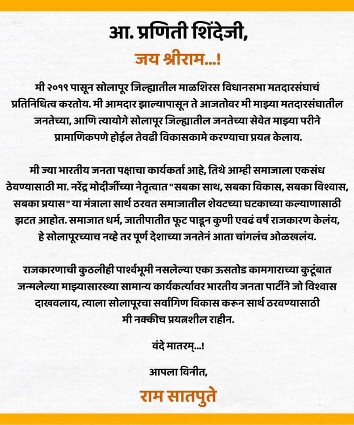 तसेच पुढील 40 दिवसात लोकांचे प्रश्न आणि विकासाचे मुद्दे याचं भान राखून, लोकशाहीचा आदर करत, आपण विचारांची लढाई लढत एकमेकांविरुद्ध उभे राहू आणि समाजात फूट न पाडता, समाजाचा एकत्रित विकास होण्यासाठी काय करु शकतो यावर लढाई लढू, अशी फटकेबाजीही त्यांनी आपल्या ट्विटच्या माध्यमातून सातपुतेंवर केली आहे. तसेच ही निवडणूक लोकशाहीच्या मार्गाने लढवू या आणि सशक्त लोकशाहीची चुणूक दाखवूया असे म्हणत प्रणिती शिंदे यांनी राम सातपुते यांना आव्हान दिले आहे. प्रणिती शिंदे यांच्या या ट्विटमुळे आता खऱ्या अर्थाने सोलापुरात राजकीय धुळवड सुरू झाल्याचे चित्र दिसून आले आहे. राम सातपुते यांना सोलापूरमधून भाजपची उमेदवारी जाहीर होताच प्रणिती शिंदे यांचे समर्थक सोशल मीडियावर सक्रीय झाले आहेत. सातपुते यांच्या विरोधात पोस्ट देखील केल्या जात आहे. ज्यात ‘चला लागा कामाला, बीडचा पार्सल बीडला परत पाठवूया’ अशा पोस्ट केल्या जात आहे. त्यामुळे सोलापुरच्या निवडणुकीत ‘भूमिपुत्र विरुद्ध उपरे’ असा थेट प्रचाराचा मुद्दा होण्याची शक्यता आहे. तर, याला राम सातपुते समर्थक कसे उत्तर देतात हे पाहणं महत्वाचं असणार आहे. भाजपकडून सोलापूर लोकसभा मतदारसंघासाठी उमेदवारी जाहीर झालेले राम सातपुते हे सोलापूर जिल्ह्यातील माळशिरस विधानसभा मतदारसंघाचे भाजपचे विद्यमान आमदार आहेत. सोबतच सातपुते हे भारतीय जनता पार्टीच्या युवा मोर्चाचे राष्ट्रीय उपाध्यक्ष देखील आहे. उपमुख्यमंत्री देवेंद्र फडणवीस यांचे ते निकटवर्तीय असल्याचे देखील बोलले जाते. 2019 मध्ये ते पहिल्यांदा आमदार झाले. आता त्यांचा सामना थेट प्रणिती शिंदे यांच्यासोबत होणार आहे. त्यामुळे सोलापूर जिल्ह्यातील राजकीय वातावरण आता तापले आहे.