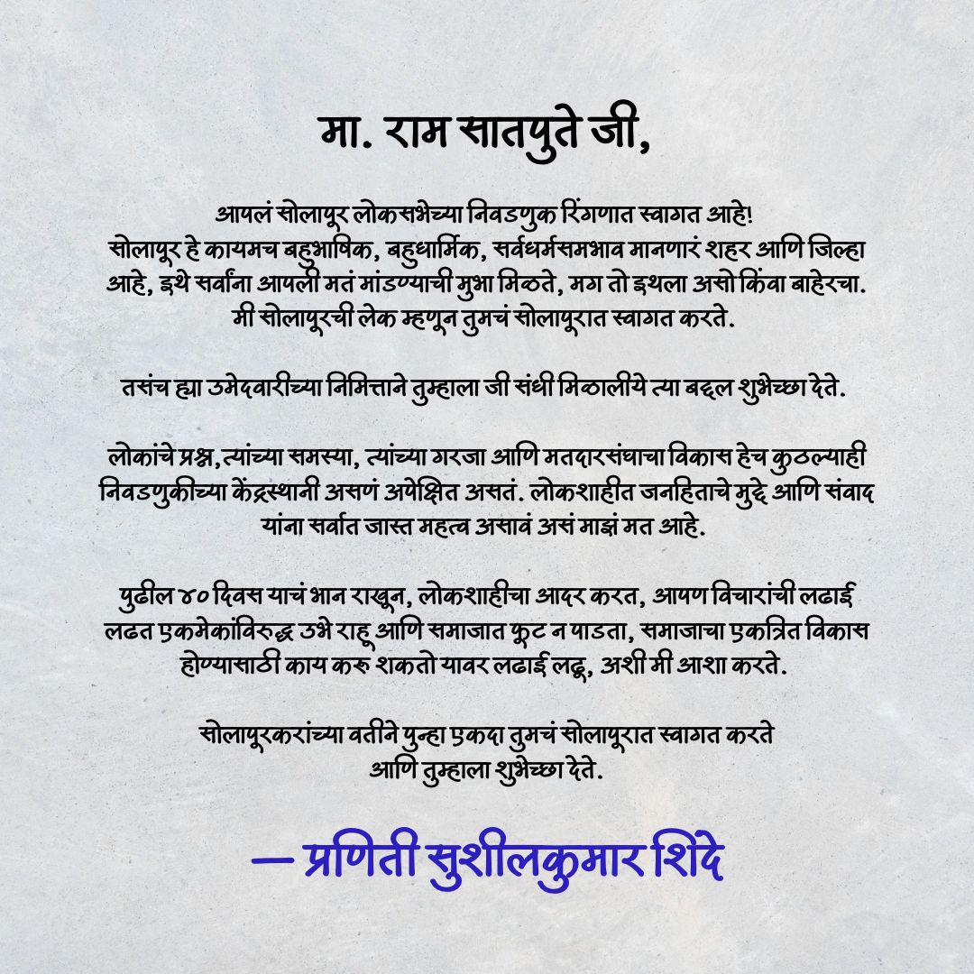 सोलापूर लोकसभा मतदारसंघासाठी भाजपकडून माळशिरसचे आमदार राम सातपुते यांना उमेदवारी जाहीर झाली आहे. त्यावर महाविकास आघाडीच्या उमेदवार आमदार प्रणिती शिंदे यांनी ट्विट करून राम सातपुते यांचे सोलापूर लोकसभा निवडणुकीच्या रिंगणात स्वागत केले आहे. सोलापूरची लेक म्हणून मी तुमचं सोलापुरात स्वागत करते असे म्हणत प्रणिती शिंदे यांनी सोलापूरची निवडणूक ‘भूमिपुत्र विरुद्ध उपरे’ असे केल्याची चर्चा आहे. राम सातपुते यांच्या उमेदवारीवर मत व्यक्त करताना प्रणिती शिंदे यांनी म्हटले आहे की, “सोलापूर हे कायमच बहुभाषिक, बहुधार्मिक, सर्वधर्मसमभाव मानणारं शहर आणि जिल्हा असून इथे सर्वांना आपली मतं मांडण्याची मुभा मिळते. मग तो इथला असो किंवा बाहेरचा, सोलापूरची लेक म्हणून मी तुमचं सोलापुरात स्वागत करते, अशा शब्दात प्रणिती शिंदे यांनी सातपुते यांना उपरोधिक टोला लगावला आहे.