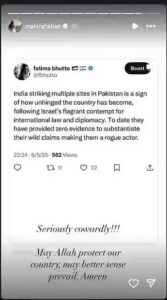 इंस्टाग्रामवर एक स्टोरी शेअर करताना तिने लिहिले ‘खूपच भित्रा.’ अल्लाह आपल्या देशाचे रक्षण करो आणि आपल्याला बुद्धी देवो. आमेन.” असे लिहिले आहे. तर पाकिस्तानी अभिनेत्री हानिया आमिरनेही इंस्टाग्रामवर एका शब्दात पोस्ट व्यक्त करत तिच्या भावना व्यक्त केला. तिने या कारवाईला कायर म्हणत त्याचा निषेध केला. पहलगनं हल्ल्यानंतर ज्या पाकिस्तानी सेलिब्रिटींच्या इंस्टाग्राम अकाऊंटवर बंदी घालण्यात आली आहे त्यात हानियाचाही समावेश आहे. पहलगाम हल्ल्यानंतर अनेक पाकिस्तानी कलाकारांचे अकाऊंट भारतात बॅन करण्यात आले. माहिरा खान, फवाद खान, अली जफर, हानिया आमिर यांचा यात समावेश आहे. याशिवाय फवादच्या अबीर गुलाल या सिनेमाच्या प्रदर्शनावर भारतात बंदी घालण्यात आली. तसंच अनेक पाकिस्तानी चॅनेलही भारतात बॅन करण्यात आले. धन्यवाद भारतीय सैन्याने दिलेल्या अहवालानुसार, ऑपरेशन सिंदूरमध्ये १७ दहशतवादी ठार झाले तर ६० जण जखमी झाले आहेत. दरम्यान पहलगाम दहशतवादी हल्ल्यानंतर महिरा खान काहीच बोलली नसल्याने चर्चा सुरु झाल्या होत्या. कारण महिरा खानने शाहरुख खानसोबत ‘रईस’ या बॉलिवूड चित्रपटात काम केले होते. परंतु, उरी हल्ल्यानंतर पाकिस्तानी कलाकारांना हिंदी चित्रपटसृष्टीत बंदी घालण्यात आली आहे.