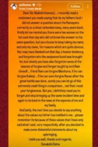 मुकेश खन्ना यांनी नुकताच सिद्धार्थ कन्ननबरोबर संवाद साधला. यावेळी तो म्हणाला की, “आजच्या मुलांना मार्गदर्शनाची खूप गरज आहे. नव्या पिढीतील मुले भरकटत आहेत. गर्लफ्रेंड- बॉयफ्रेंडसोबत फिरत राहते. आजची मुले इंटरनेटमुळे भरकटत आहेत. त्यांना आजी-आजोबांची नावेही आठवत नाहीत. एका मुलीला तर हनुमानाने संजीवनी बुटी कोणासाठी आणली होती हेसुद्धा माहीत नव्हते आणि ती मुलगी शत्रुघ्न सिन्हा यांची मुलगी आहे. तिच्या अपूर्ण माहितीसाठी तिचे वडील शत्रुघ्न सिन्हा जबाबदार आहेत. तिच्या भावांची नावे लव आणि कुश आहेत आणि तिच्या घराचे नाव रामायण आहे, तरीही तिला रामायणाचे ज्ञान नाही.” यावर सोनाक्षीने पलटवार केला आहे. ती म्हणाली की, ”प्रिय सर, मुकेश खन्ना जी… मी तुम्ही नुकतंच केलेलं वक्तव्य वाचलं. खूप वर्षांपूर्वी मी एका कार्यक्रमात रामायणसंदर्भातील प्रश्नाचं योग्य उत्तर देऊ शकले नाही, ही माझी नव्हे तर माझ्या वडिलांची चूक आहे, असं तुम्ही म्हणालात. मी तुम्हाला आठवण करून देते की त्या दिवशी हॉट सीटवर दोन महिला होत्या, ज्यांना त्याच प्रश्नाचं उत्तर माहीत नव्हते, पण तुम्ही फक्त माझे नाव घेता, त्याचं कारणही स्पष्ट आहे. प्रभू श्रीराम जर मंथराला माफ करू शकतात, कैकेयीला माफ करू शकतात आणि युद्ध झाल्यानंतर रावणालाही माफ करू शकत असतील तर तुम्हीही ही अत्यंत छोटी गोष्ट विसरू शकता.”, असं म्हणत तिने प्रत्युत्तर दिले आहे.