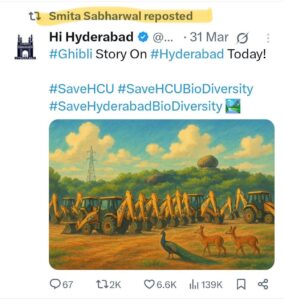 हैद्राबाद – दराबाद सेंट्रल युनिव्हर्सिटीजवळील ४०० एकर जमिनीवरील झाडे तोडल्याबद्दल AI च्या मदतीने बनवलेली घिबली इमेज सोशल मीडियावर रि-शेअर केल्याबद्दल पोलिसांनी अलिकडेच समन्स बजावलेल्या वरिष्ठ आयएएस अधिकारी स्मिता सभरवाल यांची बदली करण्यात आली आहे.